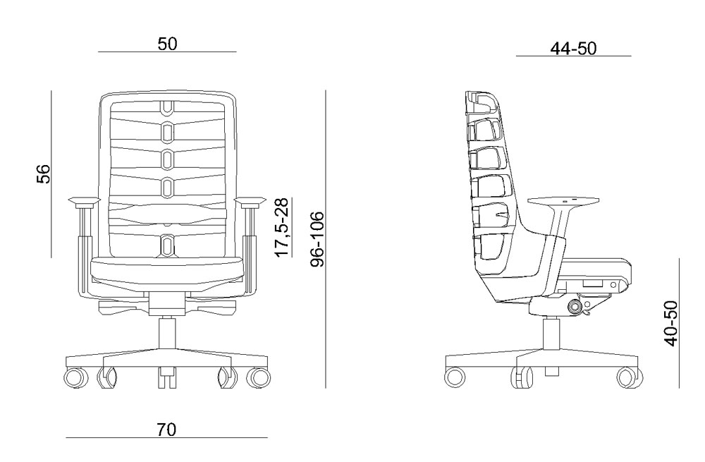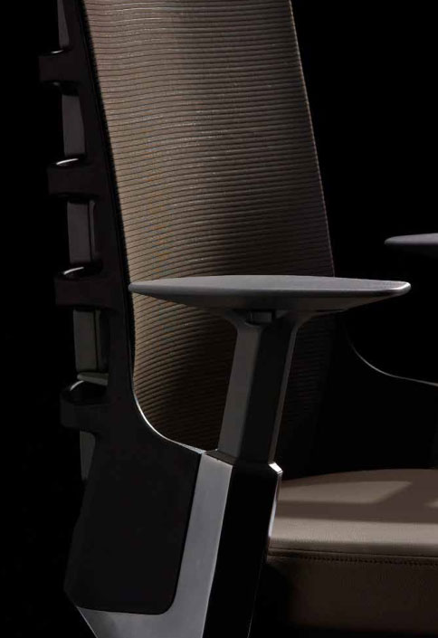 - Siedzisko - konstrukcja wykonana z czarnego polipropylenu. Siedzisko pokryte formowaną pianką poliuretanową tapicerowane tkaniną materiałową (18 kolorów) lub skórą naturalną (3 kolory). Regulacja wysokości w zakresie 100 mm, regulacja głębokości w zakresie 60 mm.