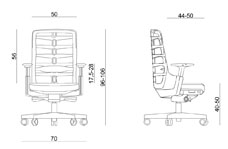 - Podłokietniki wykonane z tworzywa polipropylenowego, posiadają miękkie nakładki z poliuretanu w szarym kolorze. Regulacja wysokości w zakresie 100 mm.