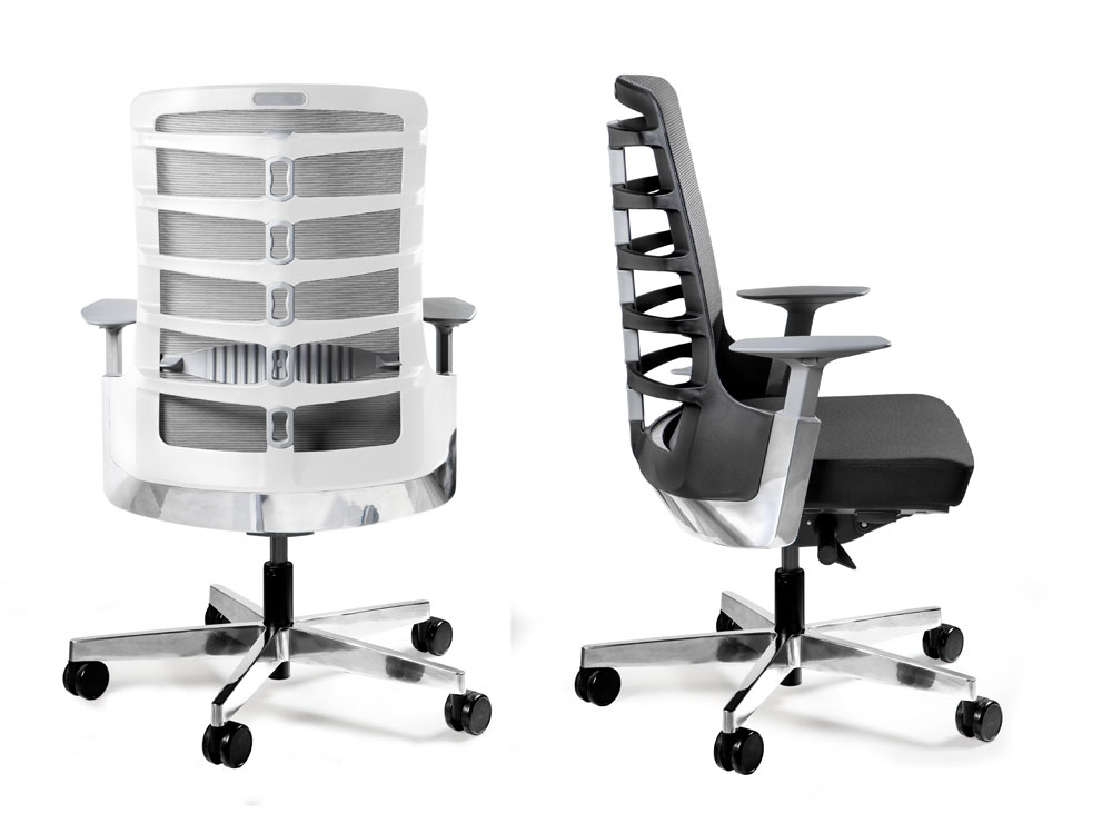 - Oparcie wykonane z tworzywa polipropylenowego w kolorze białym lub czarnym. Łączenie imitujące kręgi wykonane jest z termoplastycznego elastomeru w kolorze szarym. Siatka na oparciu w kolorze szarym.
